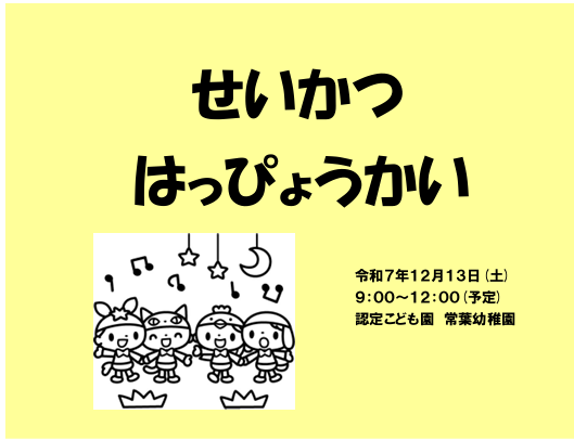 12月13日(土)の生活発表会に向けて、練習をしています。(写真はモザイクがかかっています。当日を楽しみにしていてください。)プログラムを添付しましたので、ご覧ください。各ご家庭には、園児を通して本日配付します。