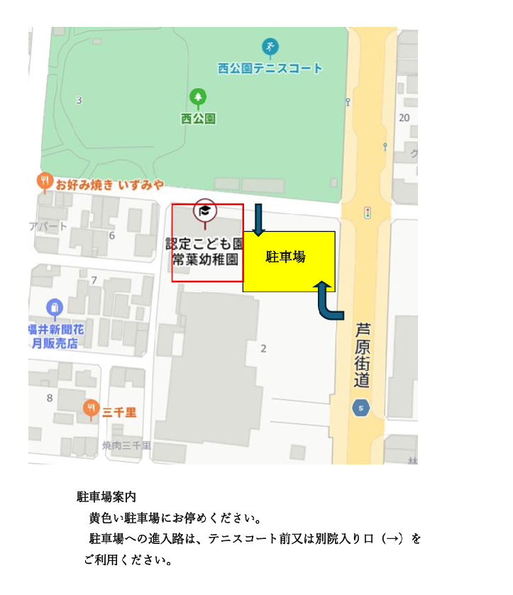 関係の皆様には、すでにご案内させていただいていますが、今週土曜日(12月6日)に、令和8年度新入児面接(2・3号)制服採寸(1号・私的)を行います。駐車場につきまして、旧花月駐車場を利用することができますので、添付資料の駐車場所にお停めください。よろしくお願いいたします。