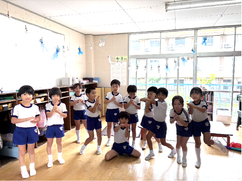 年長さんが、てるてる坊主を作って、「明日晴れますように」と願っています。願いが叶いますように。