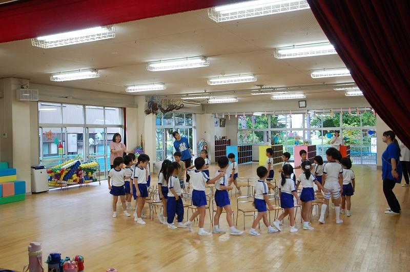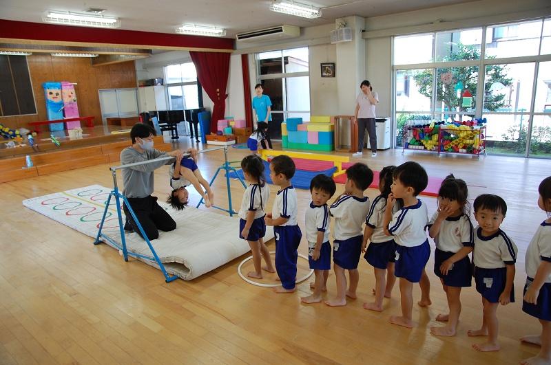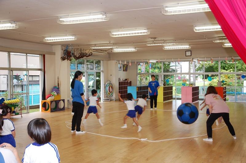 運動会が終わってから、2週間がたとうとしていますが、子どもたちは、今も忍者のように素早く動く修行をしています。もも組は、体操教室でマットの上をころがったり、鉄棒にぶら下がったりしてきたえています。きく組・まつ組は、いす取りゲームで素早くいすに座ったり、ドッジボールで敵の攻撃から素早く逃げたりする修行をしています。修行をしながら、順序良く並んで待つことやルールを守って楽しく遊ぶことを学んでいます。