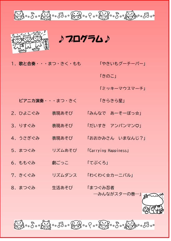 12月13日(土)の生活発表会に向けて、練習をしています。(写真はモザイクがかかっています。当日を楽しみにしていてください。)プログラムを添付しましたので、ご覧ください。各ご家庭には、園児を通して本日配付します。