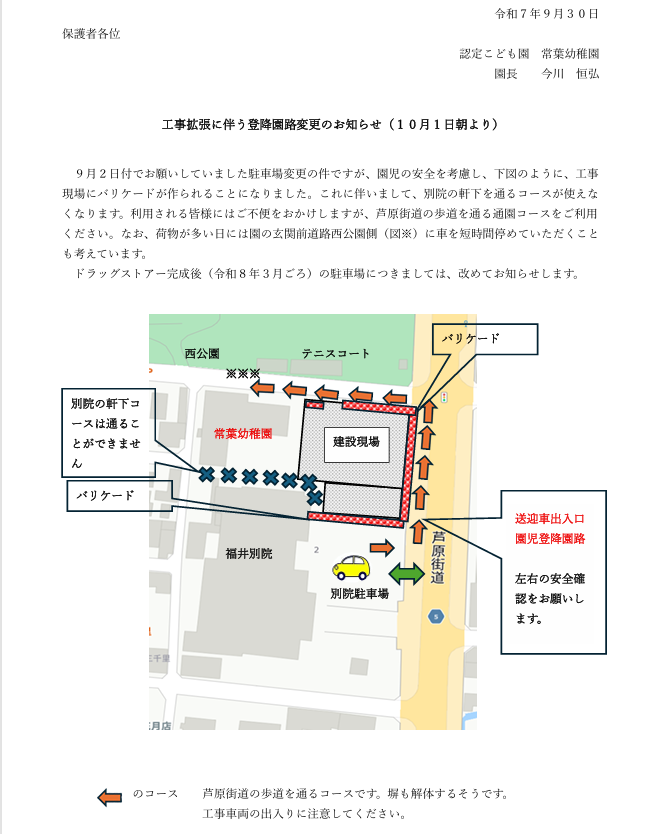 これまで使わせていただいていた旧花月駐車場が、10月1日朝より建設工事のため利用することができなくなりました。別紙のように、福井別院前の駐車場をご利用ください。なお、別院の軒下を通るコースも安全のため使うことができませんので、芦原街道の歩道をご利用ください。