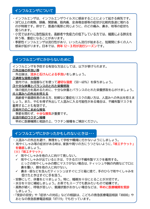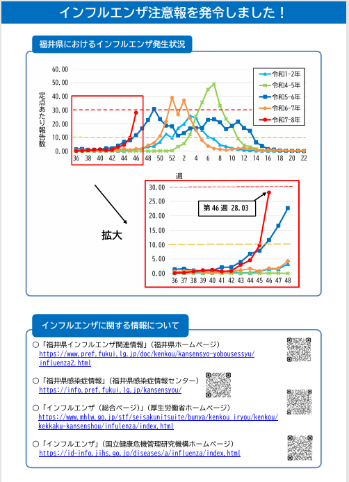 インフルエンザで休んでいる子どもさんは一名です。県が、インフルエンザ注意報を発令しましたので、お知らせします。