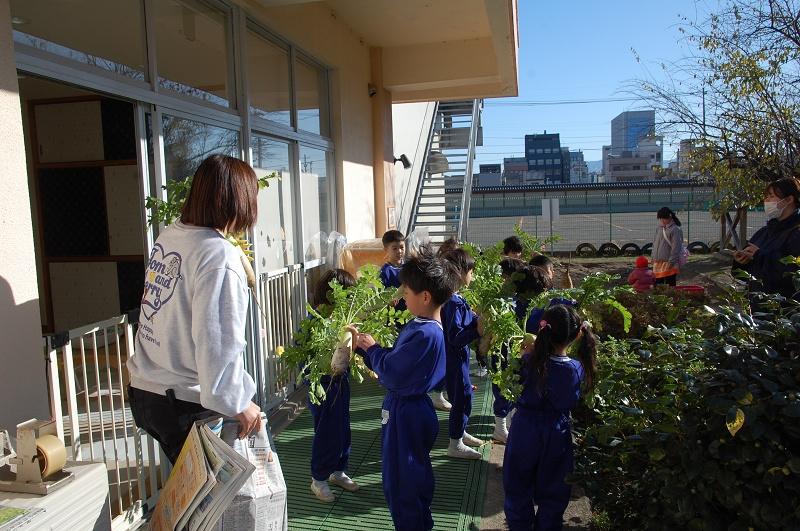 2学期の終業式をしました。スライドを使って4月から今日までの行事を振り返りました。終わった後、まつぐみさんは、これまで育ててきた大根をぬき、お土産として持って帰りました。