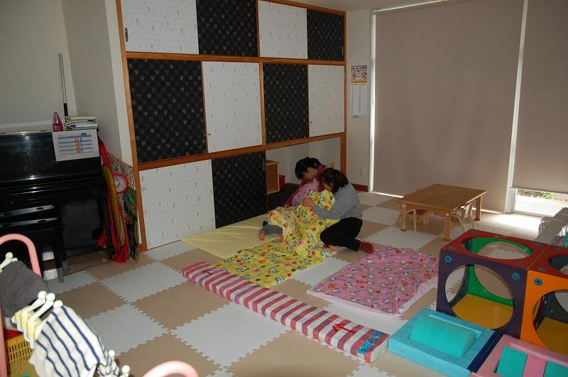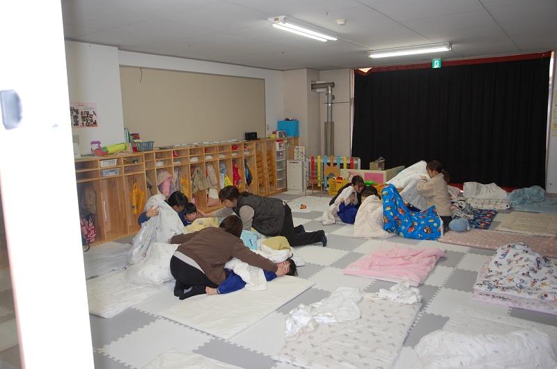 午後の遊びの時間(お昼寝から起きる時間)に、避難訓練を行いました。放送の合図とともに、保育教諭が部屋の中央に向かい、子どもたちを集めました。上からの落下物から身を守るために、布団などをかぶせました。常葉幼稚園は、耐震補強を行って安全ですが、建物の被害が大きい場合は、東別院に移動し、保護者の方に緊急連絡をすることになります。