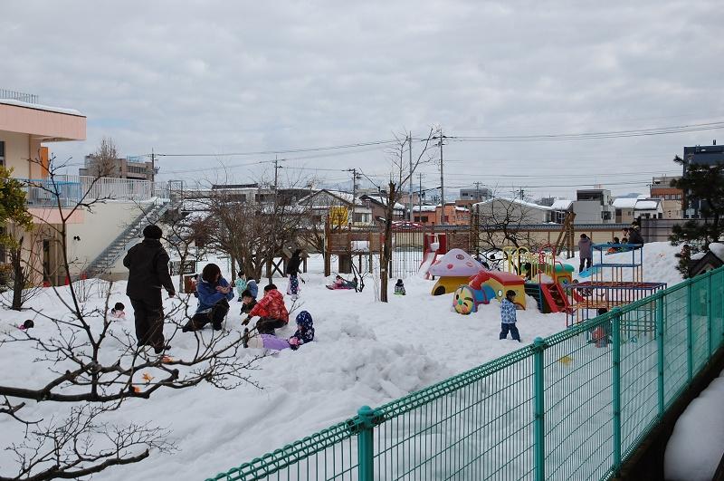 天気と積雪に恵まれ、思いっきり雪遊びを楽しみました。昨夜からの冷え込みで、園の雪山はそり遊びをするのにちょうどよい硬さの斜面になりました。