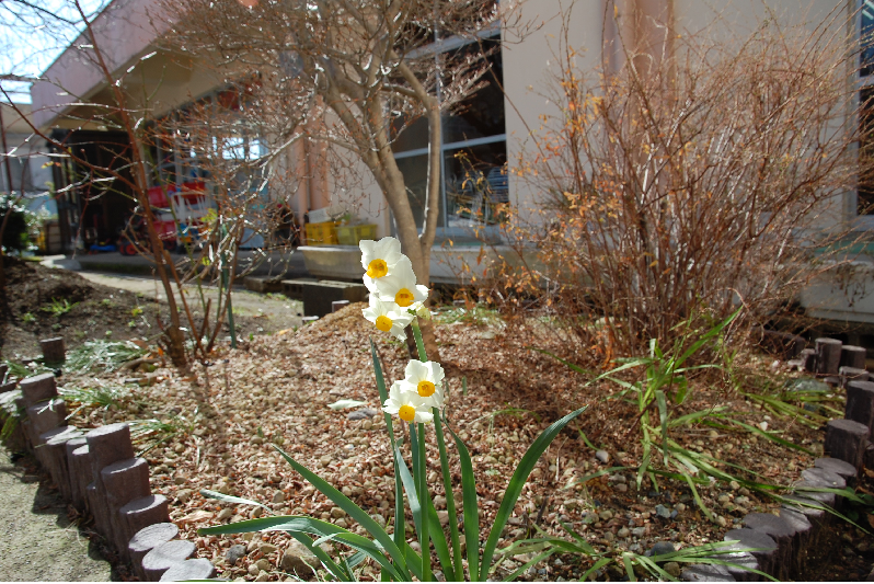 雪に覆われていた園庭ですが、陽があたっているところから雪が解け始めています。今は、冬と春が半々の状態です。園庭の片隅には、つぼみのまま雪に埋まっていたスイセンが顔を出し、可憐に咲き始めました。