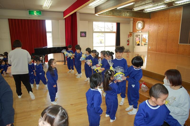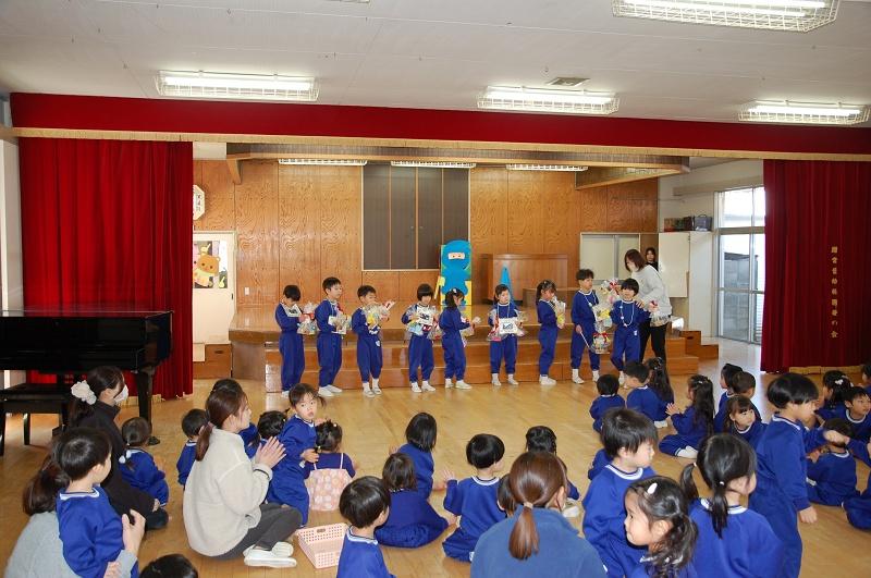 インフルエンザで休む園児が多かったため、給食まつりは急きょ中止にしました。お別れ会は予定通り行い、「まつぐみさん当てクイズ」、在園児からの「たくさんあそんでくれてありがとう」のプレゼント、まつぐみさんからの「うたのプレゼント」で楽しい時間を過ごしました。