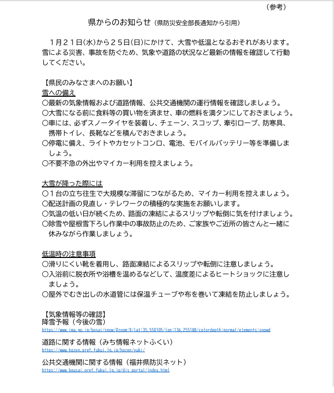 県から大雪に関する注意喚起の文書が届いています。十分ご注意ください。