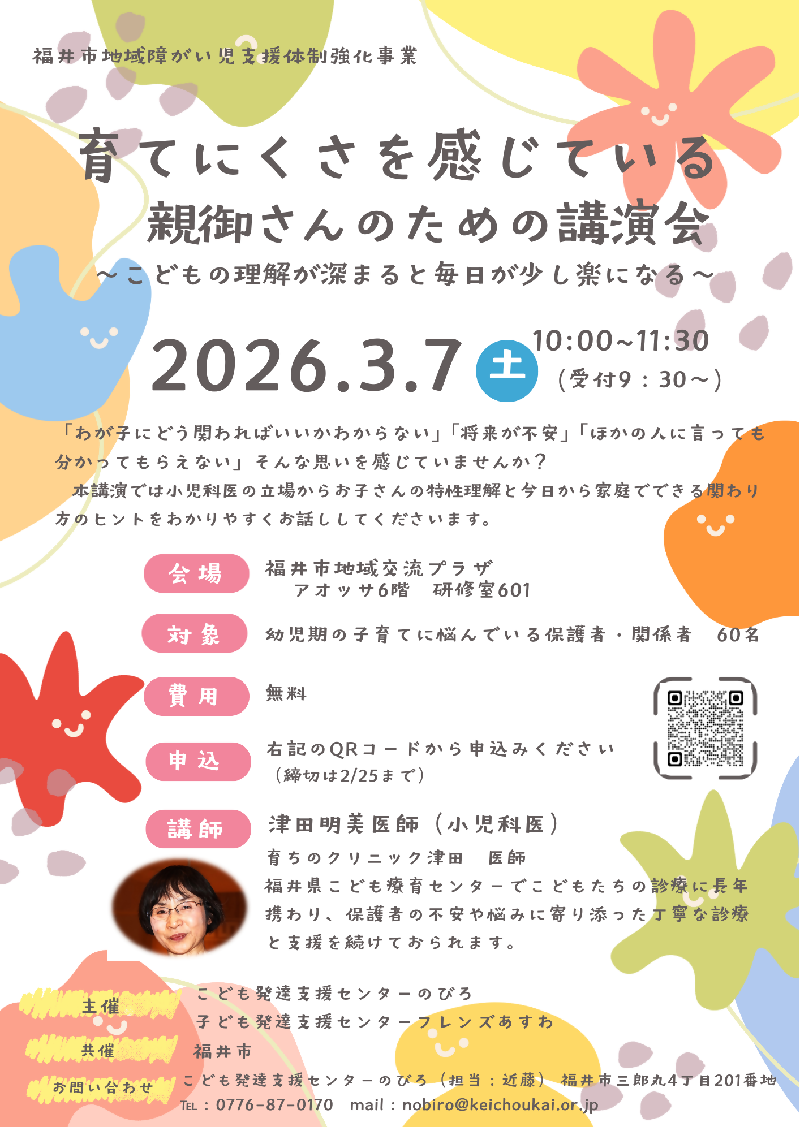 講演会のご案内が届いています。小児科医 津田明美先生をお迎えし、お子さんの特性理解と家庭でできる関わり方のヒントをわかりやすくお話していただくそうです。希望される方は、添付のチラシからお申し込みください。