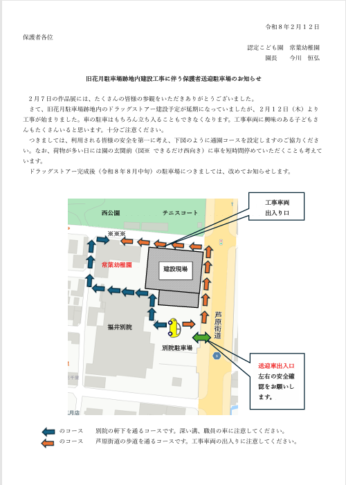 旧花月駐車場で、設計の見直しにより着工が遅れていましたドラッグストアーの建設が始まりました。工事現場では、働く特殊車両を見ることができますが、大変危険ですから、工事現場に近づかないようにお願いします。
